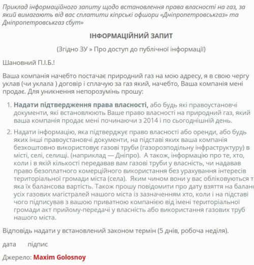 У 2016 році сільрада Єлизаветівка отримала позов від компанії “Днепропетровскгаззбут” на 85 тис грн. за газ, спожитий без договору. Але для того щоб суд став на сторону позивача, вважає Максим Голосний, позивач повинен довести, що в трубі, яка належить громаді Єлизаветівки, знаходиться його газ. “Але довести це неможливо, так як теоретично права на газ можуть пред’явити 32 газопостачальні компанії. Неможливо довести і походження газу, російський він чи вітчизняний “, – стверджує Максим Голосний.